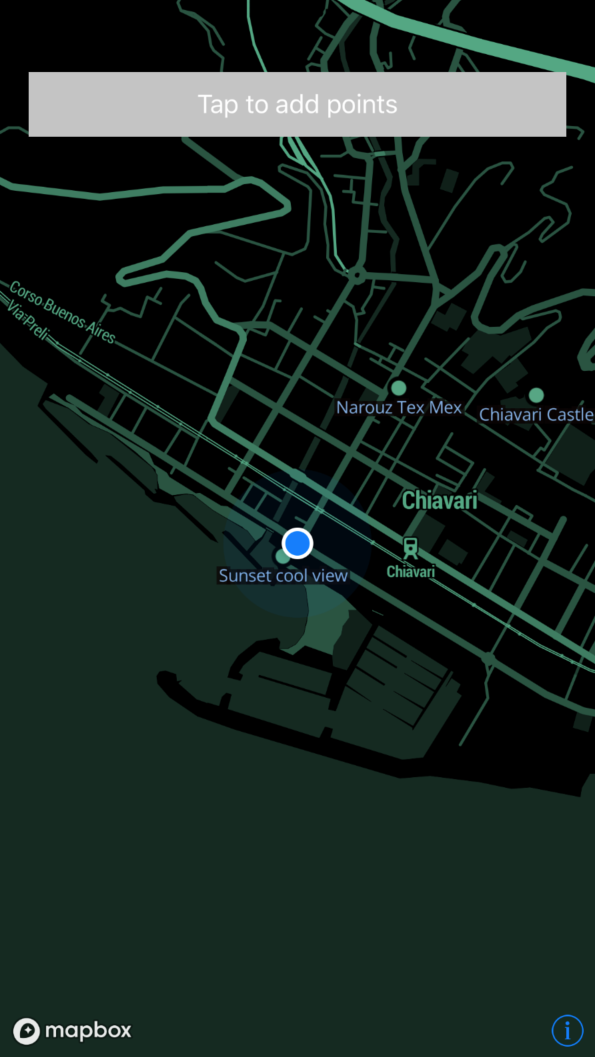 This is my map created with Mapbox Studio with some points of interest in Chiavari about local and Tex-Mex food and some beautiful view from the historical castle and all the Tigulio gulf near the sea.